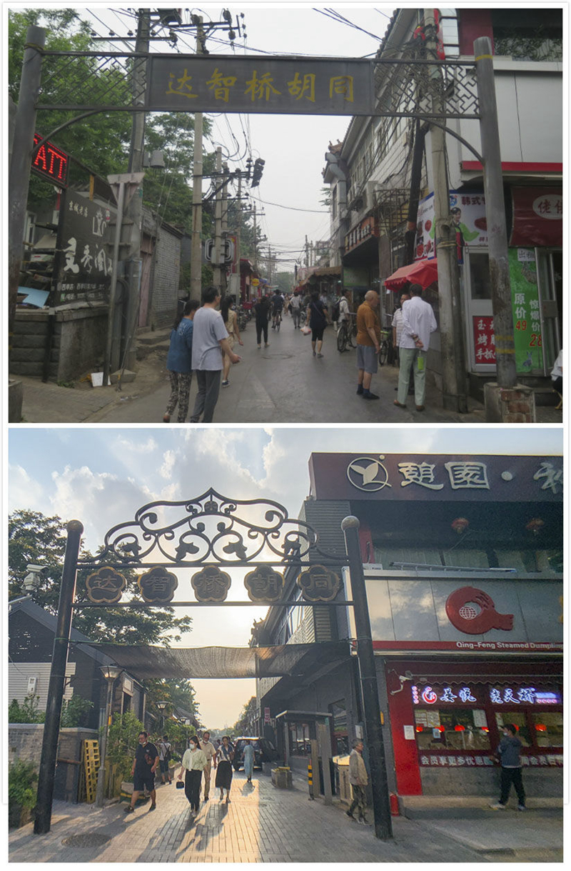 ↑拼版照片:上图为改造前的北京市西城区广内街道达智桥胡同(2015年5月28日摄);下图为面貌一新的达智桥胡同(2022年7月30日摄)。