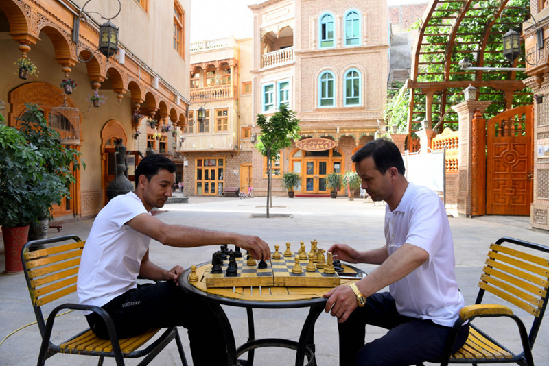 ↑两名商户在新疆和田市“团城”的鸽子巷下棋(2020年5月26日摄),过去这里的居民以出售鸽子等为生。历经4年改造,鸽子巷由曾经脏乱差的棚户区变身为古城的新名片。